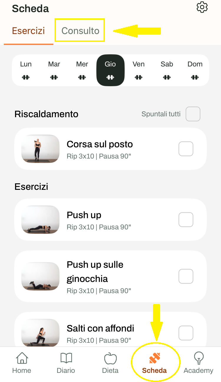 Vai nella sezione Scheda, clicca su Consulto, seleziona la tipologia di appuntamento (consulto o allenamento live) e verrai reindirizzato al calendario del Personal Trainer, dove potrai scegliere lo slot disponibile e confermare la prenotazione.